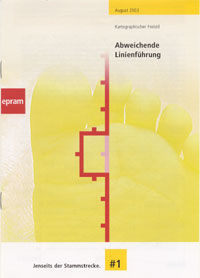 In August 2004, epram.org launched "Abweichende Linienführung", a free magazine project in three issues inspired by the leaflets of the same name found on the city's trams containing details of construction/repair work and rerouting on the network. epram's version was distributed both on the trams themselves and at other locations around town (full list here). Featuring material on the theme of "Cartographic Freestyle" including contributions from: Philip Wincolmlee Barnes // Brixton Moose Society // Roger Frank // GPS Drawing // Nick Grindell // Matthias Hintzen // Seth Kriebel // Sal Randolph // Monika Rinck // socialfiction.org // tsz. // Graphic Design: Roger Frank // Editor: Nick Grindell // Although the copies distributed around Berlin in August have almost certainly disappeared by now, epram still has some. Mail us a request with your address and we'll send you a set. | ||||||||||||||||||||||||||||||||||||||||||||||||||||||||||||||||||||||||||